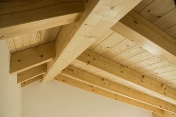 Von innen nach außen: Rigidur 15mm, Instalationsebene gedämmt 60mm, BSP (Massivholz) 100mm, Holzständer 200mm mit Einblasdämmung Holzfaser, 60mm Holzfaserputzrägerplatte,Sichtdachstuhl