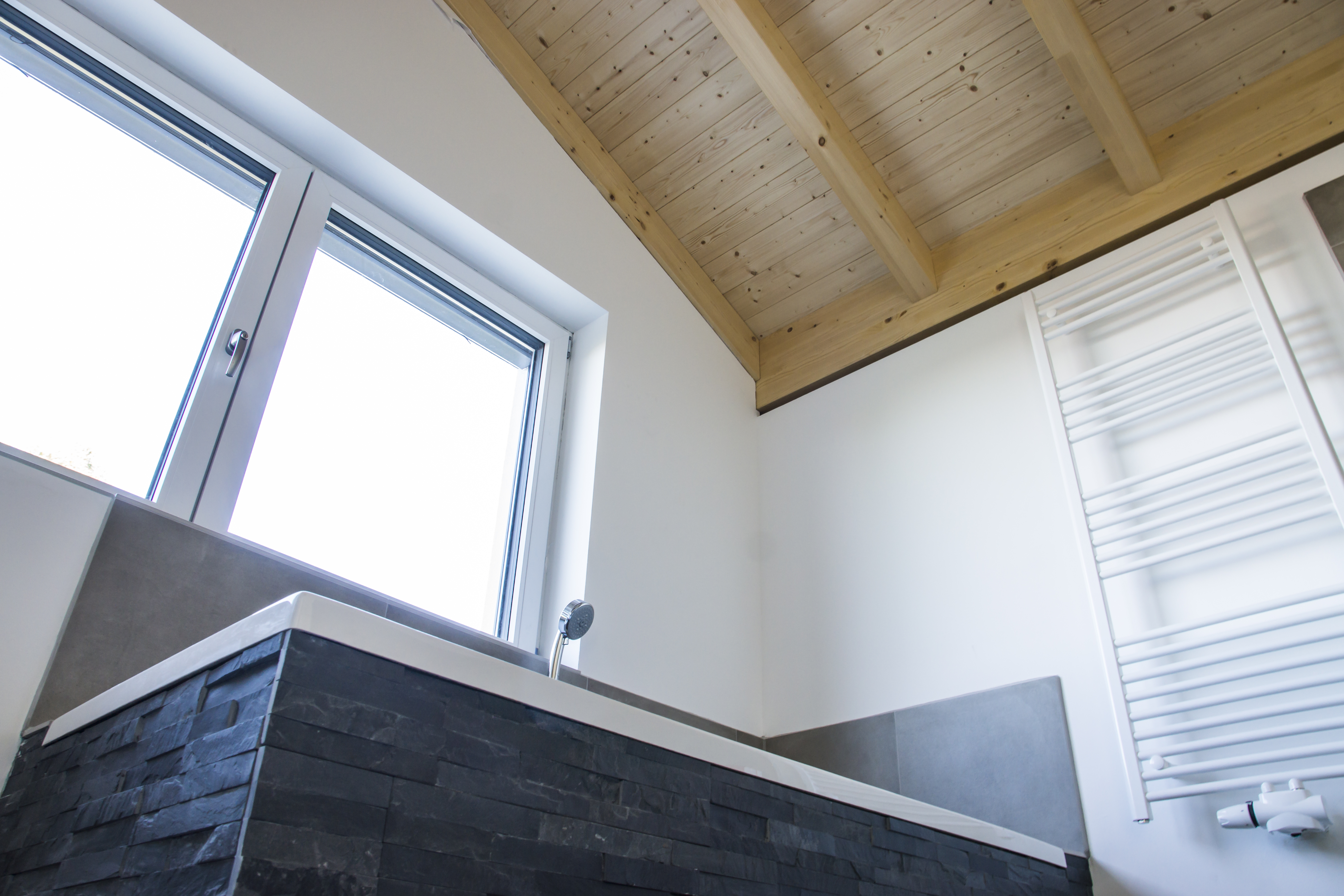 Konstruktion: Massivholzmauer mit vorgehängter verputzter Fassade, U-Wert 0,123 W/m²K