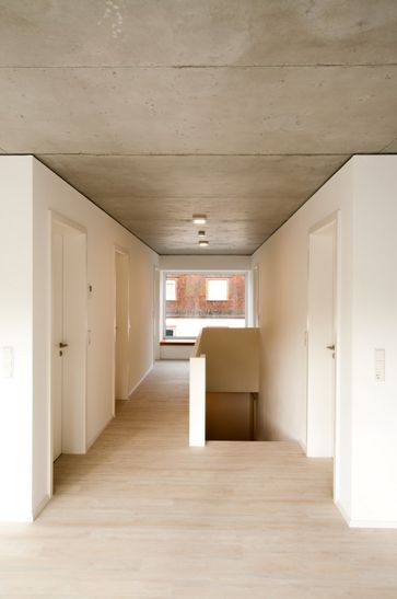 Die Außenwände entstanden in Massivbauweise mit Stahlbeton unter Verwendung von Thermoplanziegel MZ70 plus Aussendämmung. Zur Ausführung kamen Stahlbeton-Sichtdecken vershen mit einem Wohnklimaregulierenden, schadstoffgeprüften Innenputz. Der erreichte Energie-Effizienzhaus-Standard ist ein KFW-Effizienzhaus 55.