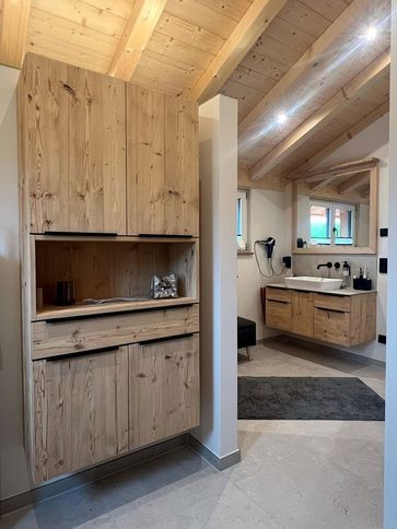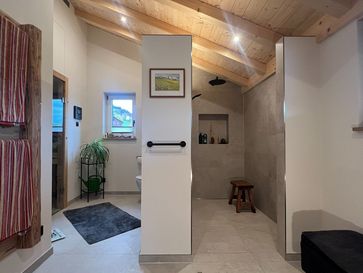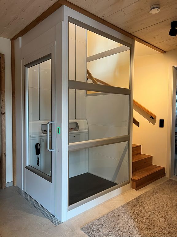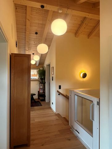 Im Inneren des Hauses wurde ebenso auf natürliche Materialien, vor allem auf Holz bzw. Altholz Wert gelegt. Dies schafft ein wohliges und angenehmes Wohnklima. Da bei dem Bauherrn eine Schwerbehinderung (Gehbehinderung) vorliegt, wurde bei der Planung großen Wert auf die Barrierefreiheit gelegt. Hierzu gehören breitere Türen, Rampe im Eingangsbereich, Berücksichtigung entsprechender Durchgangsbreiten, ebenerdige Dusche sowie ein zentral eingebauter Aufzug.
