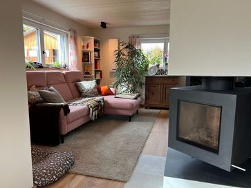 Die Bauherren wollten nicht auf eine offene Feuerstelle im Wohn-/Essbereich verzichten. Diese dient zugleich in der Übergangszeit für wohlige und angenehme Wärme. Durch eine dezentrale Lüftungsanlage mit 3 Einzelgeräten werden die Wohnräume dauerhaft mit Frischluft versorgt.