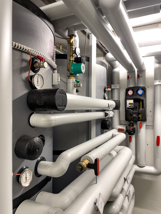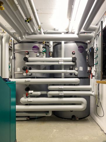Für die Warmwasserbereitung wurden zwei Hygiene-Systemspeicher mit je 1.000 Litern Volumen installiert, inklusive Hochleistungs-Trinkwasser-Wärmetauscher. Den Abschluss bildeten sämtliche erforderlichen Elektro- und Heizungsinstallationen, die das Gesamtsystem technisch perfekt miteinander verbinden.
