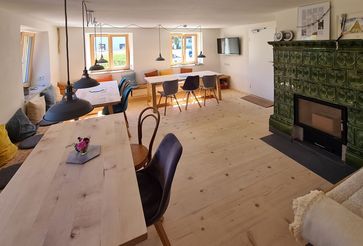 zu 20 Personen, im Winter unterstützt vom zentralen Kachelofen mit Wassertasche. Eine