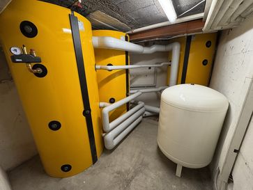 Um die Wärme perfekt zu speichern und zu verwalten wurden auch die alten Puffer und Boiler durch 3 neue ETA Puffer a 1100 Liter Inhalt und eine Kaskade aus 4 Frischwassermodulen ersetzt.