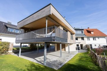 Zubau: Holzbau auf Stützen, Holzrahmenbauwände, Brettsperrholzdecken und -dach